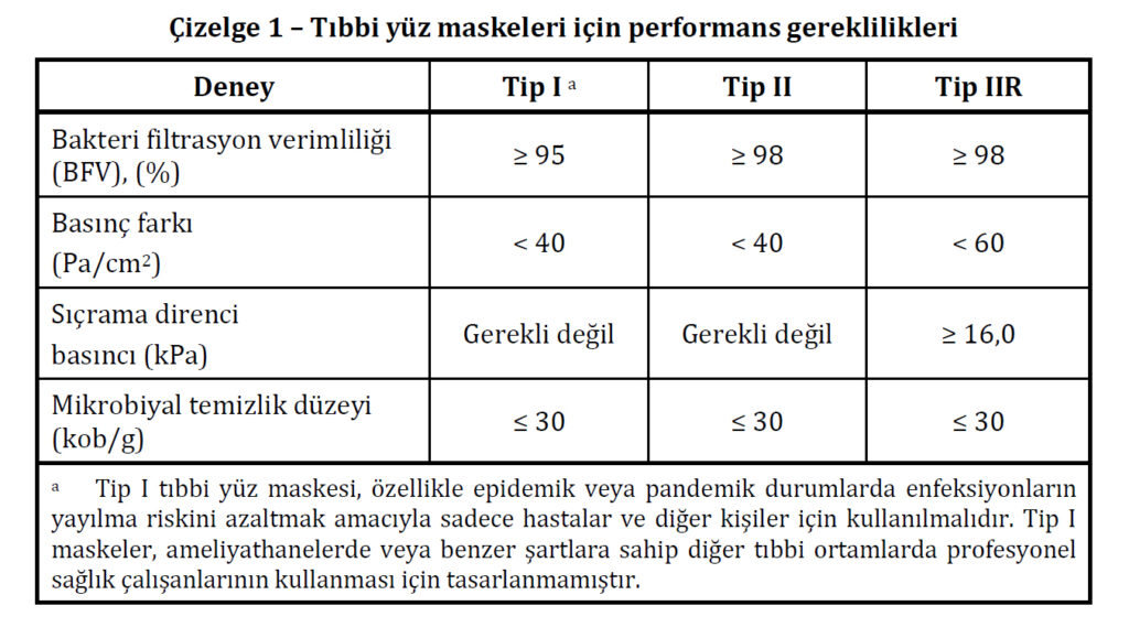 EN 14683 Performans testleri; bakteri filtrasyon etkinliğinin değerlendirmesi (BFV), hava geçirgenliği basınç farkı (diferansiyel basınç), mikrobiyal temizlik düzeyi, ISO 22609:2004 standardına göre sıçrama dayanıklılık direnci basıncı (Tip IIR maskeler için) ve biyouyumluluk testleri şeklinde sıralanabilir. Cerrahi maskenin kullanım amacı ve üretim amacına göre uygulacak tüm performans testleri çizelge 1’deki gibi olmalıdır.