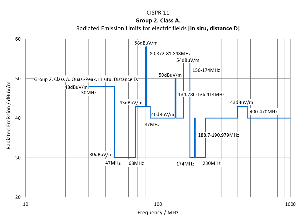 CISPR 11’de belirtilen ileten ve yayılan emisyonlar için sınırlar bulunmaktadır. Aşağıda, bir test alanında (yerinde değil) gerçekleştirilen ölçümler için sınırları bulabilirsiniz.